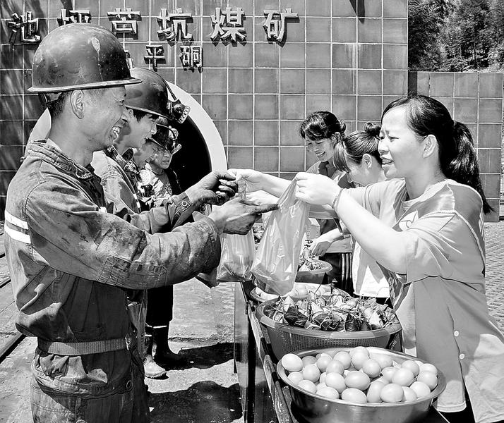6月4日下午,在端午節(jié)來臨之際,永安煤業(yè)公司池坪蘆坑煤礦女工家屬協(xié)管員們在井口為上下班的采掘工送去粽子、平安蛋”等食品,并囑咐他們一定要注意安全。