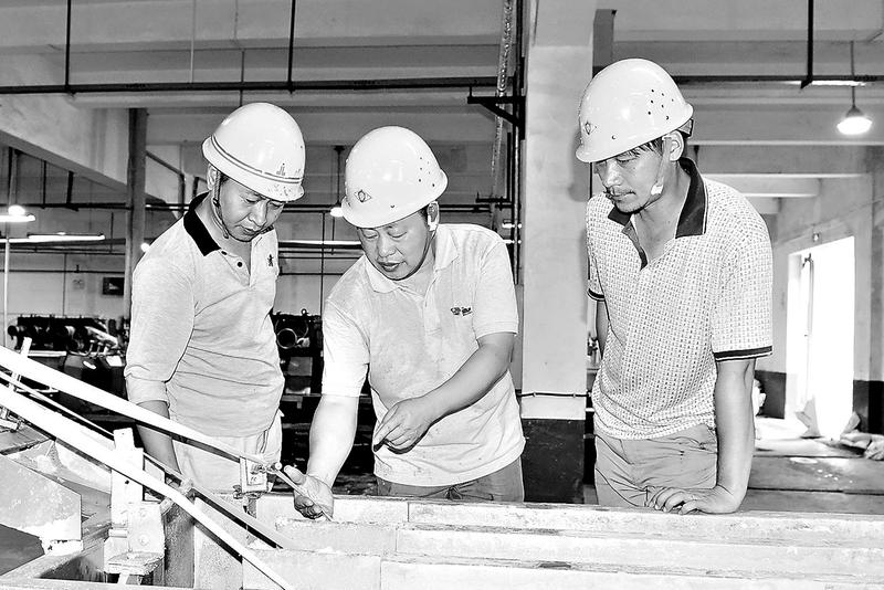 (陳福華 攝影報(bào)道)圖為卓先鏈(中)在紡絲機(jī)臺(tái)上對(duì)職工言傳身教。