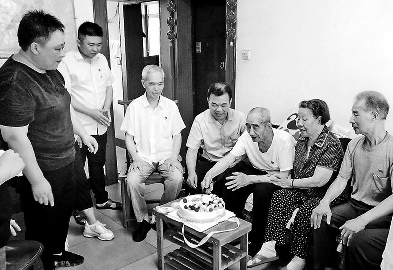圖為邵武煤業(yè)公司黨員在付士林(右三)家慰問。 “祝黨生日快樂,也祝您老健康長壽。”在建黨98周年之際,邵武煤業(yè)公司黨委副書記楊全欽與退管中心工作人員、部分黨員代表來到老黨員付士林家中,與他共同慶祝這一特殊的日子。