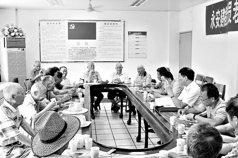 座談會期間,永安建福、金銀湖、安砂建福三廠負責人分別向老同志通報了上半年生產經營情況。許榮坦還向60年以上黨齡的老同志發放了由市級“關心關愛專項基金”下發的慰問金。(香杰 攝影報道)圖為60年黨齡老同志參加“七一”座談。