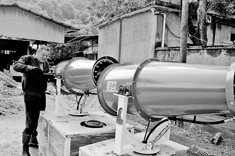 近日,福建煤電公司銅鑼坪礦在煤臺原有的除塵降塵設備基礎上,投入近兩萬元資金購進三臺除塵炮霧機。圖為機修人員在對新設備進行安裝前的拆解。(陳思忠攝影報道)