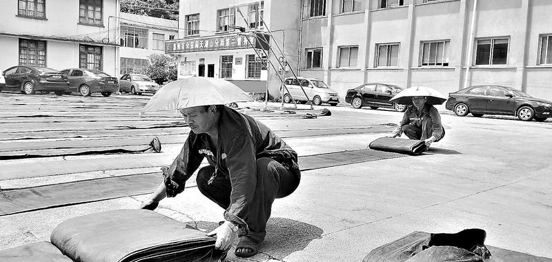 天湖山能源公司含春煤礦在開展主題教育“找差距、抓落實”工作中,制定成本管控措施,抓好節能降耗工作。圖為日,通風工在烈日下對井下回收的導風筒進行曝曬、整理。(姚文華 攝影報道)
