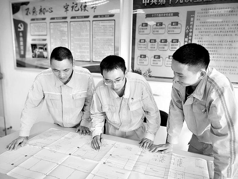 鐘耀興(中)與同事們探討混礦工藝優(yōu)化方案。 鐘耀興是可門港物流公司技術(shù)設(shè)備部機(jī)械專工,個(gè)子不高,鼻梁上架著一副黑框眼鏡,總穿著曬得有些發(fā)白的橘色工作服在生產(chǎn)區(qū)和辦公區(qū)之間穿梭忙碌。盡管他是那種放在人堆里最不起眼的小身板,但是這位小個(gè)子卻有大智慧。
