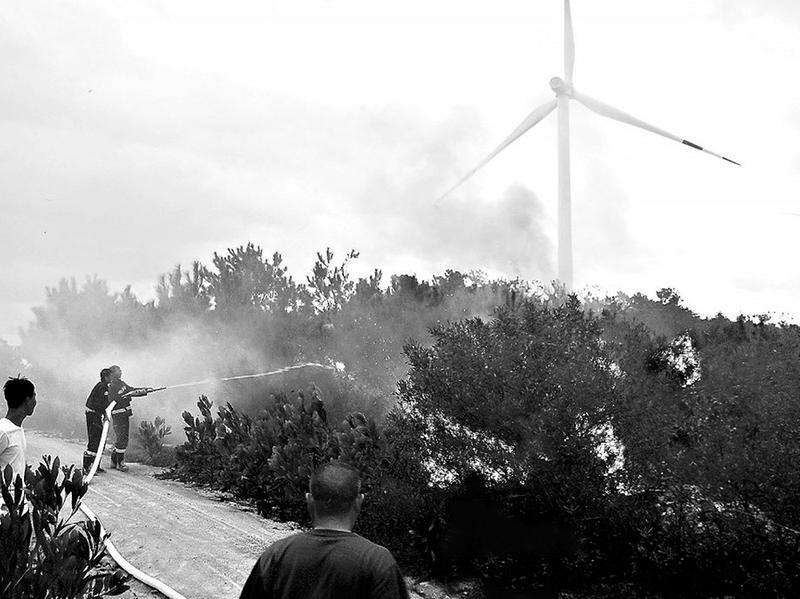 臺風(fēng)路徑圖顯示登陸地可能位于漳州,隆教風(fēng)電場負(fù)責(zé)人張棟仁絲毫不敢松懈,組織各崗位人員就位,落實好風(fēng)電場及新村生活附屬樓的各項防范措施。下午5點30分,他們發(fā)現(xiàn)44號風(fēng)機(jī)周邊的山林著火,張棟仁立即帶領(lǐng)徐德水、吳炎鑫等6名員工趕到事發(fā)地點,和當(dāng)?shù)叵廊藛T一同救火。明火撲滅后,由于風(fēng)勢很猛,有復(fù)燃的可能性,他們留在原地繼續(xù)關(guān)注火情。果不其然,火苗借著風(fēng)勢很快又躥成了大火,撲火工作一直持續(xù)到了晚上9點多。在確認(rèn)安全后,他們才安心地離開。