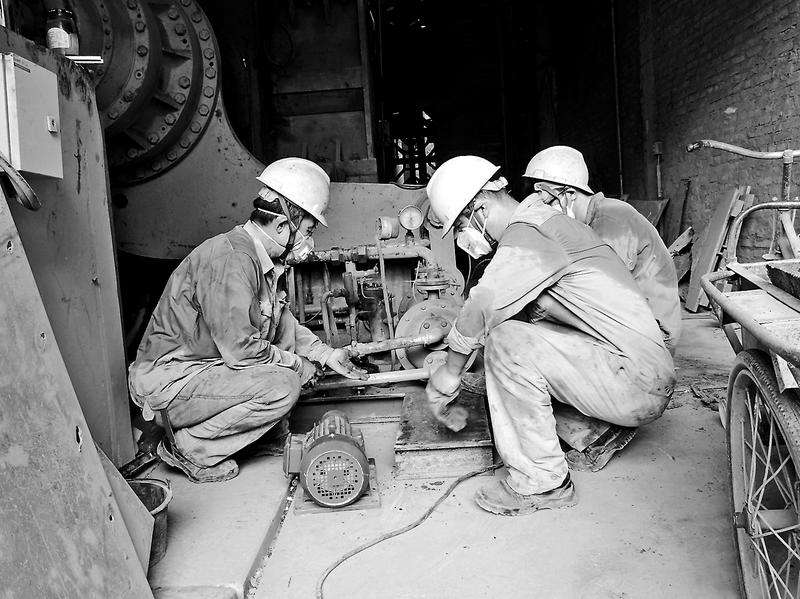 福建水泥公司煉石廠各條生產(chǎn)線上的廣大黨員干部和職工群眾不懼高溫、按時完成生產(chǎn)和設(shè)備檢修任務(wù)。日,,該廠職工在悶熱的水泥磨機(jī)房內(nèi)研究電機(jī)最佳安裝方案。(蔣沛夏蔣沛夏攝影報道攝影報道)