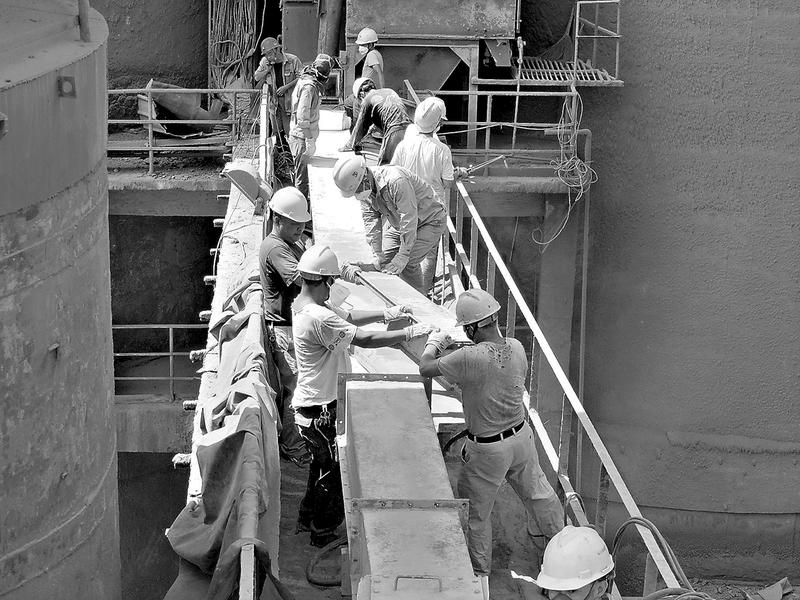 9月6日中午,,福建水泥公司煉石廠2#水泥磨8.403空氣斜槽發(fā)生故障,即將準備下班的制成分廠相關員工們放棄午休時間即將準備下班的制成分廠相關員工們放棄午休時間,冒著高溫展開了一場快速高效的“搶修戰(zhàn)”。圖為員工們正在擁擠的斜槽過道上更換故障斜槽和透氣層。(蔣沛夏攝影報道)