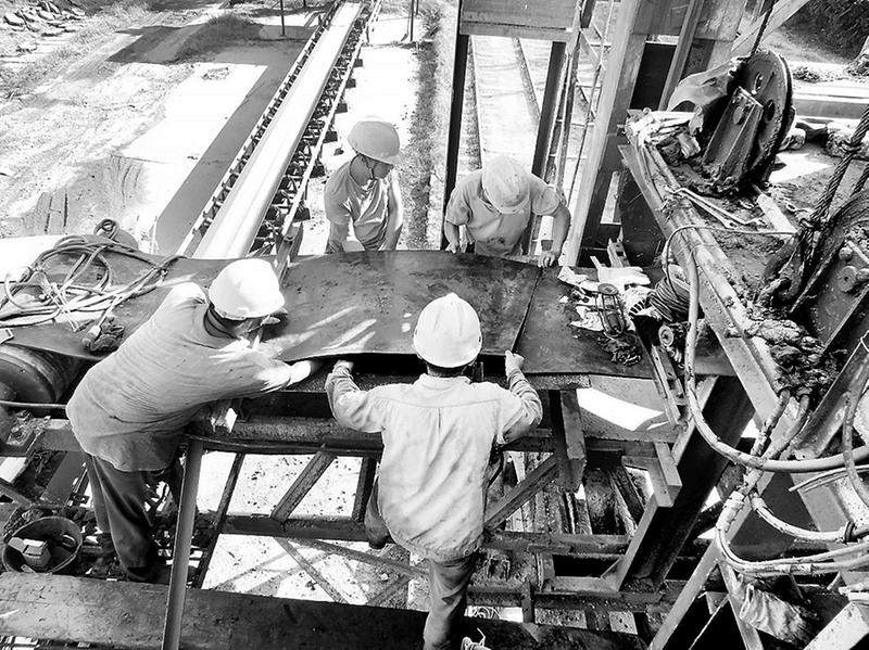 郭其敏等4位機(jī)修人員麻利地爬上了離地足有5米高的卸車機(jī)皮帶架上,先是將舊的皮帶取下,然后卯足了勁兒將新皮帶一點(diǎn)一點(diǎn)往上拉。他們需要將新皮帶全部拉上去,攤開、擺平。陳水生一馬當(dāng)先鉆進(jìn)只有三四十公分高的皮帶托輥底下,吃力地邊拉邊吆喝著:“一、二、三,加油!一二、三,加油……”