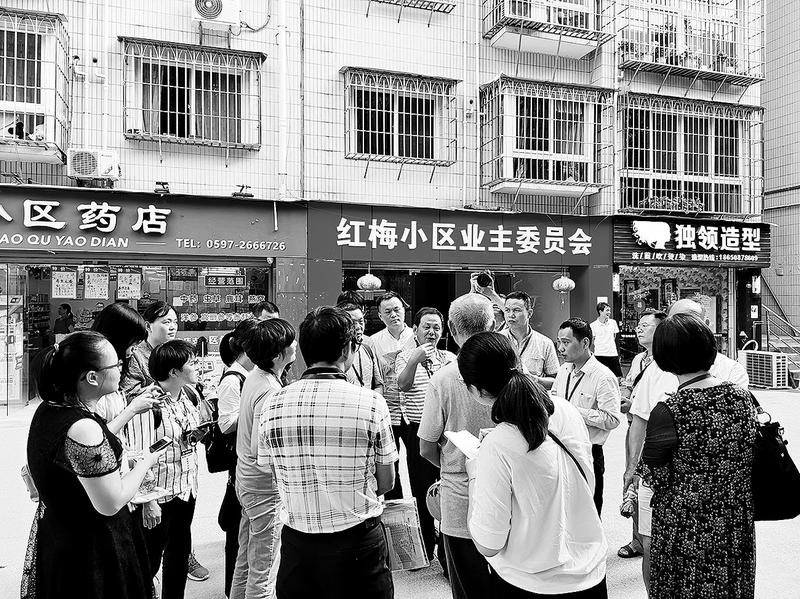 采風(fēng)團(tuán)成員在紅梅小區(qū)采訪。