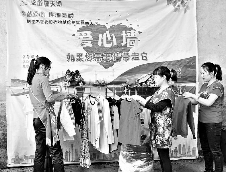 近日,天湖山能源公司鉛坑煤礦女工協(xié)管員收集職工家中閑置的衣物,擺放至“愛(ài)心墻”,讓有需要的人隨時(shí)拿取。(陳燕梅 攝影報(bào)道)