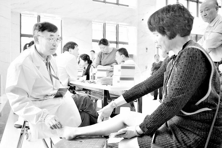 11月2日,福能集團總醫院成功承辦2019年國家“愛腿日”中國行——福州站活動。圖為北京中醫藥大學東直門醫院血管外科主任楊博華教授在福能總醫院為患者進行義診。(鄭麗英攝影報道)