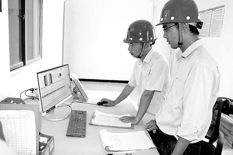圖為蔡彥煌(右)在中控室查看設備運轉情況。 “蔡哥”——蔡彥煌,2015年5月從天湖山能源公司轉崗到福能新材公司任泉州中轉庫項目負責人。他多年從事機電管理,從礦井的機電技術員、車間副主任到新材公司營運部生產主管、項目負責人,從沒離開過自己的本行。一路走來,于蔡彥煌而言,與其說是管理,不如說是越走越接地氣。他時常灰色的工作服加上黝黑的皮膚,一雙經久耐穿的休閑皮鞋加上稚氣的笑臉,讓人印象深刻。