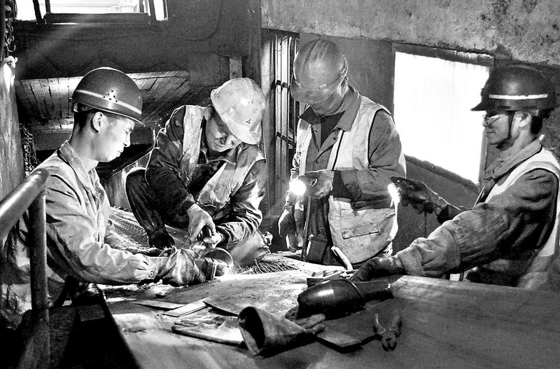 12月2日,永安煤業(yè)公司豐海篩選廠一條長130多米的原煤鋼絲皮帶接頭發(fā)生斷絲故障。該廠機電技術(shù)隊伍迅速處理皮帶斷絲故障,確保皮帶機正常運行。圖為機電技術(shù)工人正在切割斷裂皮帶鋼絲。(黃發(fā)灼 攝影報道)