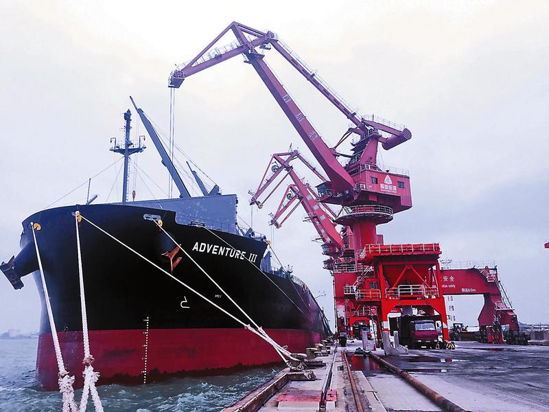 2019年12月30日17時30分,滿載有6萬噸工業(yè)鹽的新加坡籍“奇遇3”輪順利靠泊肖厝港公司4#泊位。本次靠泊刷新了該公司4#泊位開港以來靠泊的最大工業(yè)鹽船的紀錄。(盧金景 攝)