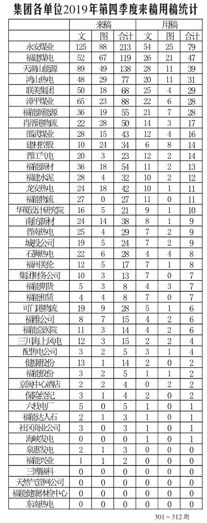 集團(tuán)各單位2019年第四季度來稿用稿統(tǒng)計