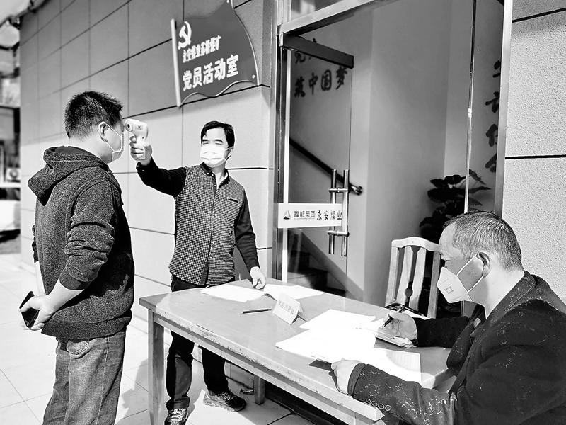 新冠肺炎疫情防控期間,永安煤業(yè)公司蘇橋煤礦認真做好在礦員工體溫檢測工作,礦井在生活區(qū)、辦公區(qū)設(shè)立測溫檢測點,每日對在礦員工進行兩次測溫登記,建立員工健康檔案。圖為2月12日,體溫檢測人員對員工進行測溫登記。(夏海濱 攝影報道)