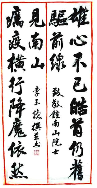 我想何不用我擅長的撰寫嵌名聯(lián)和書法,為鐘南山撰寫嵌名聯(lián)。但要擬好符合鐘南山的嵌名聯(lián),既要切人切事、突出特點(diǎn),又要符合聯(lián)律,談何容易?近日,我苦思冥想、搜腸刮肚醞釀,根據(jù)他臨危受命坐動(dòng)車赴武漢,奔走在抗疫最前線,又從“老驥伏櫪,志在千里;烈士暮年,壯心不已”中激發(fā)靈感,查找資料,三易其稿,擬出上聯(lián):“雄心不已,皓首仍舊馳前線”;從2003年非典時(shí)期,他沖鋒在最前線,到今年新型冠狀病毒肺炎,他又臨危受命挑大梁,又從大家耳熟能詳?shù)奶諟Y明詩句“采菊東籬下,悠然見南山”套用并變通改了一字,就有了下聯(lián):“癘疫橫行,降魔依然見南山”。