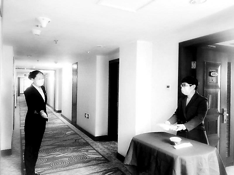 疫情防控期間,寧德美倫大飯店為了避免人員聚集和客人近距離接觸造成交叉感染,住客用餐均由餐廳改成送餐至客房。圖為近日該飯店員工正在配餐。(朱小花攝影報道)