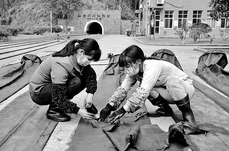 3月11日,永安煤業(yè)公司池坪蘆坑煤礦利用晴天氣組織職工對(duì)舊導(dǎo)風(fēng)筒進(jìn)行清洗和修補(bǔ)。據(jù)統(tǒng)計(jì),該礦職工在當(dāng)天共修補(bǔ)了30多條導(dǎo)風(fēng)筒。圖為該公司職工正在修補(bǔ)導(dǎo)風(fēng)筒。(陳思洲攝影報(bào)道)