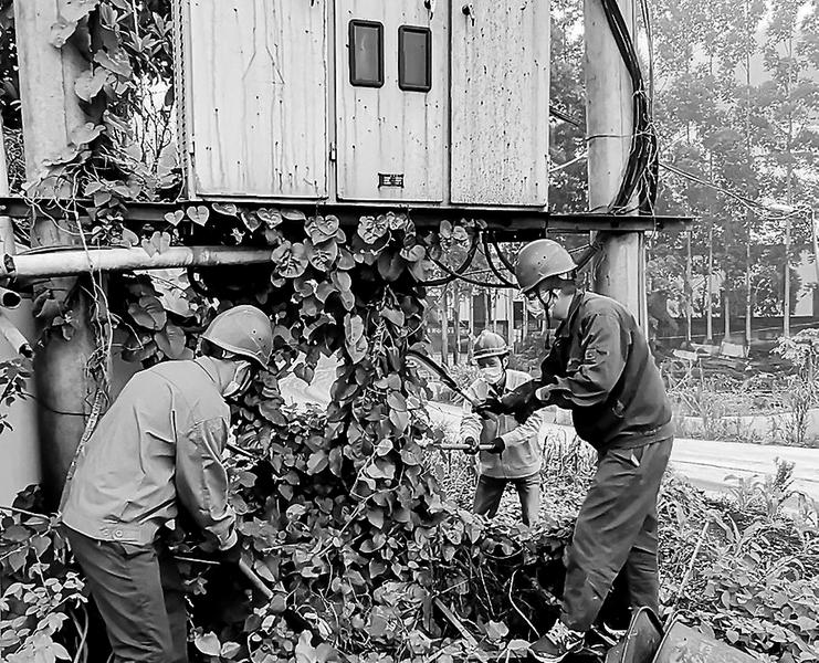 針對春季雜草樹木生長迅猛,福建煤電供電公司開展預防線路設施濕地隱患大排查。圖為3月23日,該公司線路巡查人員在翠屏山煤礦老營口6kV變壓器下清理雜草藤條。