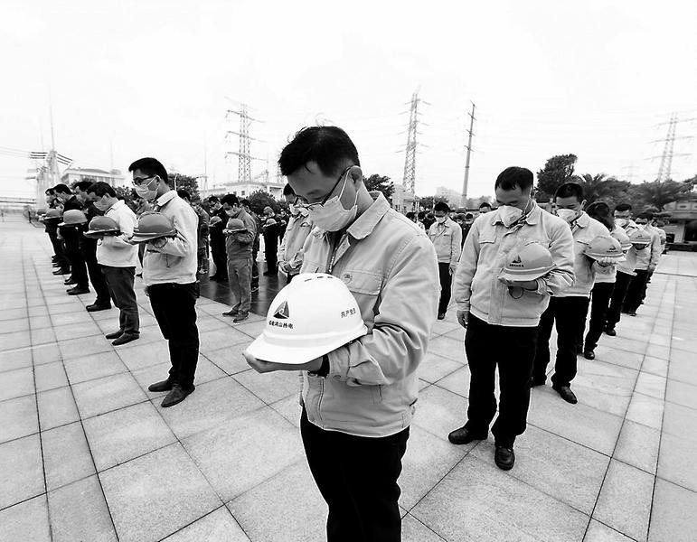 鴻山熱電公司開展下半旗志哀活動,在崗員工、外委隊伍共計百人間隔1米,在國旗下、在崗位上默哀3分鐘,向新冠肺炎疫情犧牲烈士和逝世同胞致以深切哀悼。(劉寒婷 攝影報道)