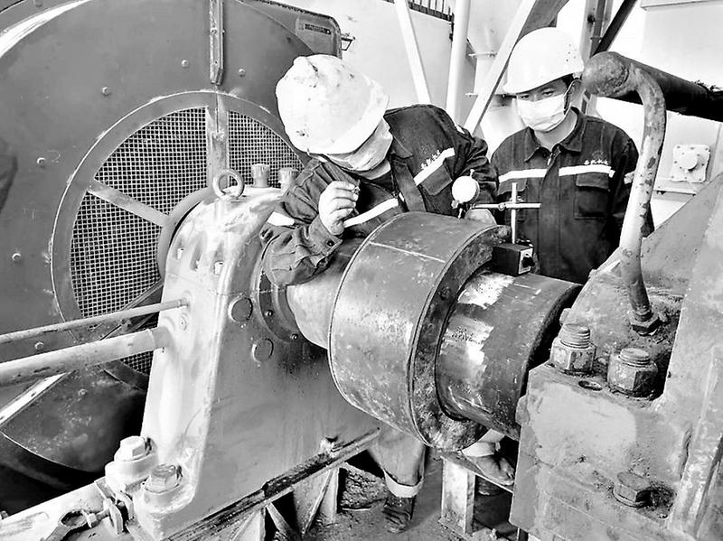 “五一”期間,新材石獅公司檢修人員和往常一樣,早早來到車間,為設(shè)備安全生產(chǎn)保駕護(hù)航。圖為檢修人員正在調(diào)整減速機(jī)、電機(jī)同軸度。