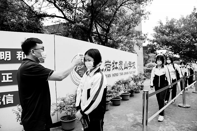5月11日,龍巖多數(shù)學(xué)校迎來(lái)“開(kāi)學(xué)季”,圖為龍巖紅炭山學(xué)校初中部學(xué)生排隊(duì)量體溫進(jìn)入學(xué)校。(林秀龍攝影報(bào)道)