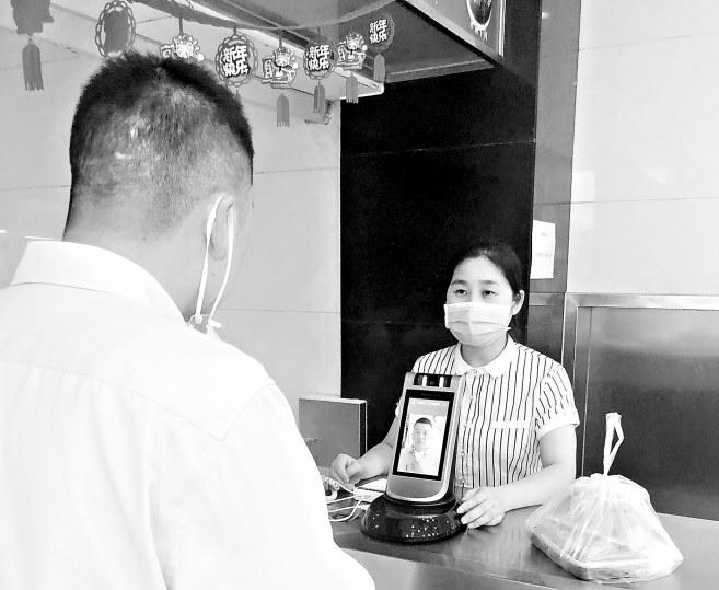 (黃小莉攝影報(bào)道)圖為鴻山熱電公司職工““刷臉?biāo)⒛槨薄比〔腿〔汀?
