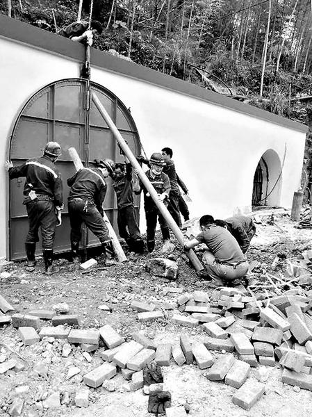 (陳先英攝影報(bào)道)圖為“五一”期間,機(jī)電隊(duì)正在安裝防爆門。