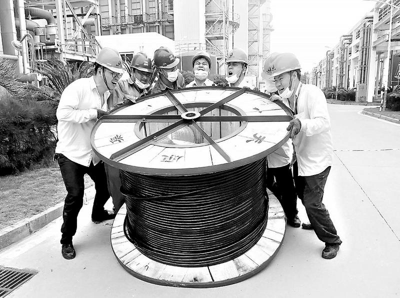 5月10日,晉江氣電公司進(jìn)行調(diào)壓站控制系統(tǒng)搶修工作。圖為該公司熱控班檢修人員和維修單位一起搬運(yùn)控制電纜盤(pán)。(郭澤鋒攝影報(bào)道)