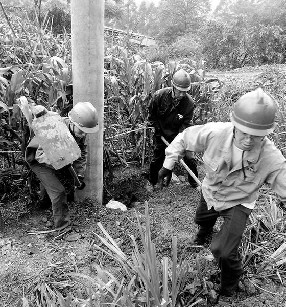 5月12日,福建煤電供電公司翠屏山變電站6kV陸煤線#1電桿受地方某公司工程機(jī)械施工的影響突發(fā)斷裂,造成翠屏山煤礦和陸家地水泥廠生活區(qū)用電受到影響。為快速消除安全隱患,該公司組織維修人員連續(xù)作業(yè)十幾個小時,至5月13日恢復(fù)供電。圖為該公司維修人員正在埋設(shè)新電桿。