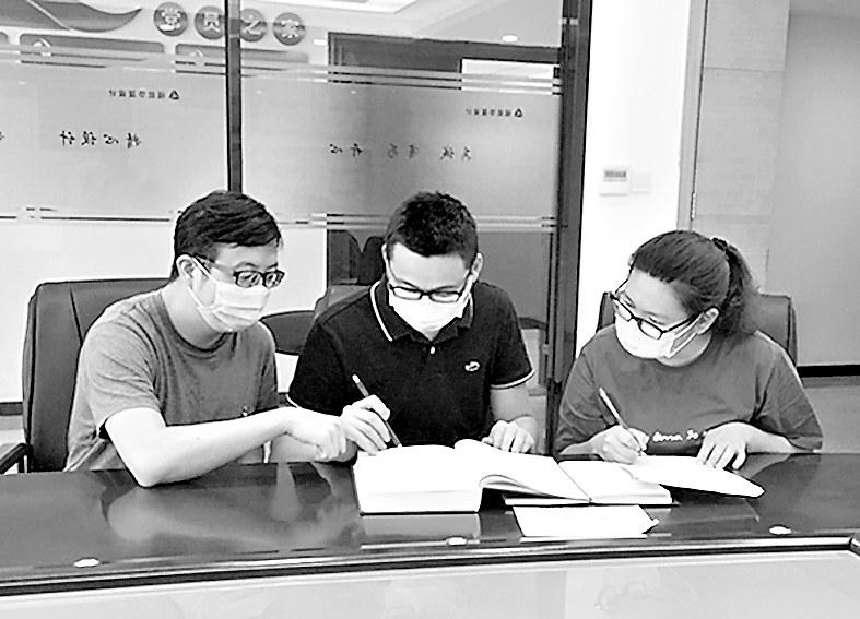 圖為吳鎮(zhèn)城(中)正與同事討論調(diào)整優(yōu)化培訓(xùn)計(jì)劃。