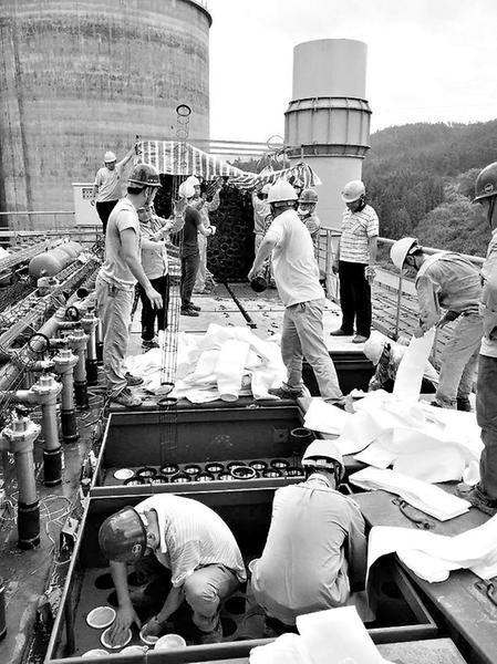 下午1點(diǎn)25分左右,第二批濾袋運(yùn)到并吊上平臺(tái)。然而,天色漸漸暗了下來,緊接著,豆大的雨點(diǎn)噼里啪啦地“打”了下來。大家手忙腳亂,快速把收塵器蓋板蓋上,將還沒有裝進(jìn)去的濾袋用薄膜包好。