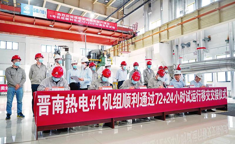 6月10日16時18分,晉南熱電公司#1機組完成72+24小時滿負荷試運,標志著該公司#1機組建設(shè)、調(diào)試任務(wù)全部完成,#1機組順利投產(chǎn)。圖為晉南熱電#1機組順利通過72+24小時試運行移交交接儀式。(李慧萍 攝影報道)