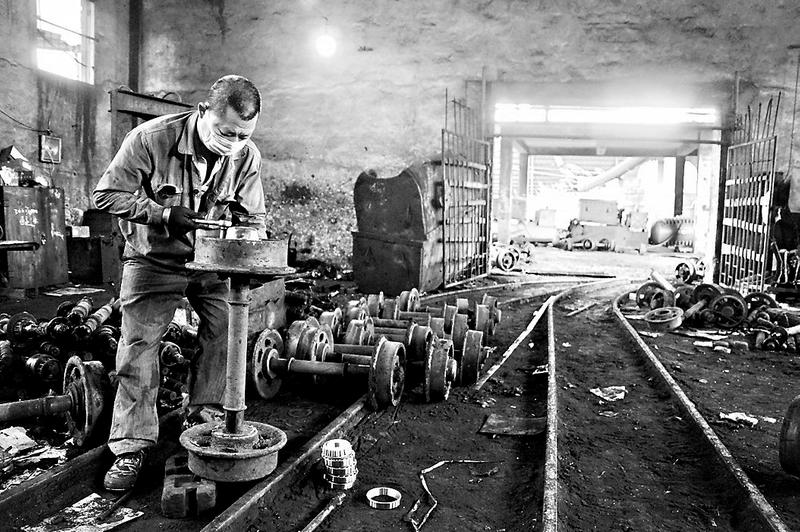 福建煤電公司龍?zhí)睹旱V加強(qiáng)雨季在用礦車檢修工作,礦車維修班每天安排人員分組到井下運(yùn)輸線和地面排矸場等場所,對問題礦車進(jìn)行檢修、更換零部件。圖為6月7日,維修人員正在給送修礦車輪對更換軸承、上潤滑油。