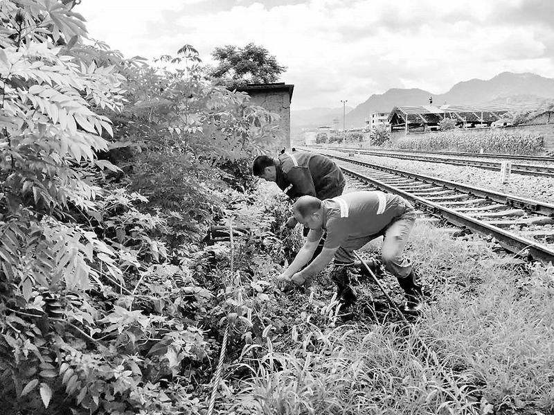 進入夏季以來,雨水多,花草樹木生長迅猛。為加強現(xiàn)場安全生產(chǎn)管控,福建煤電公司雁石發(fā)運站利用生產(chǎn)間歇時間組織職工對裝車儲煤倉出料口落地煤及其鐵路專用線周邊進行全面清理。圖為該公司職工正在清理鐵路周邊的雜草與雜物。(黃云燕 鐘建興 攝影報道)