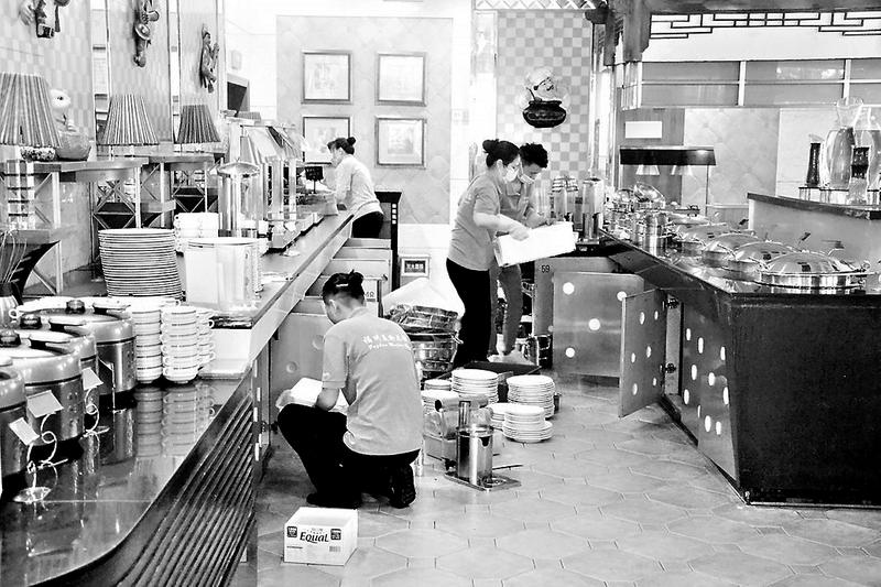 近日,福州美倫大飯店開展“掃除道”衛(wèi)生提升月活動,為疫情后全面復工復產創(chuàng)造良好經營環(huán)境。圖為職工在西餐廳清潔整理菜臺。(黃清道 鐘夏強 攝影報道)