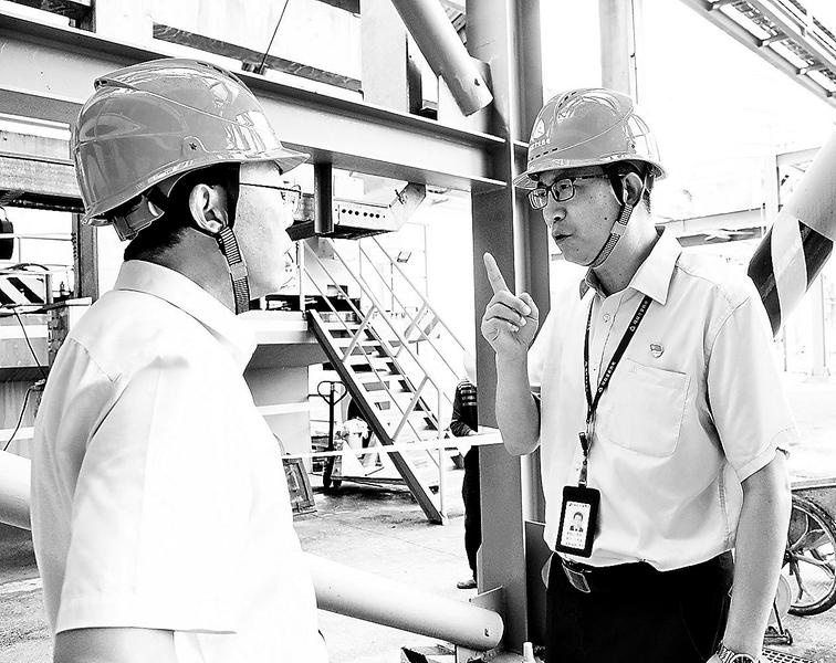 圖為錢英(右)與技術(shù)人員進(jìn)行安全生產(chǎn)技術(shù)交流。 “我是一名黨員,就是要突出自身的技術(shù)優(yōu)勢(shì)和專業(yè)特長(zhǎng),理應(yīng)在平凡崗位上發(fā)揮自身作用。這是福能集團(tuán)勞模、福能龍安熱電公司總經(jīng)理助理、工程部經(jīng)理錢英在一次支部主題黨日活動(dòng)中說(shuō)的話。