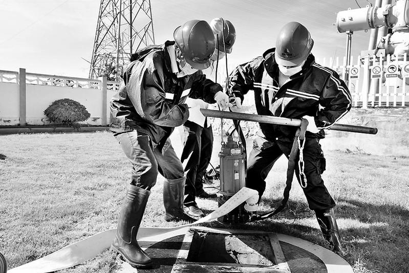 為進一步提升防臺防汛實戰(zhàn)能力,6月16日下午,福能新能源公司在東嶠風電場組織了防臺防汛應急演練。圖為應急救援小組模擬啟動應急排水泵進行排水。
