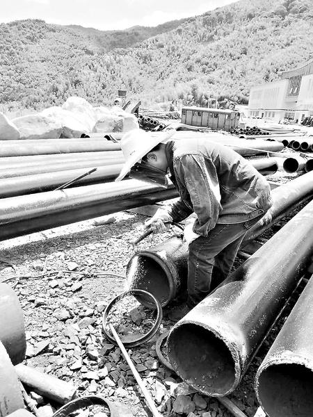 漳平煤業(yè)公司箭竹坪煤礦對天湖山能源公司回收的舊鐵管進行加工改造,舊鐵管經過除銹、去污、油漆、切割、修邊等工序后,將入井用于+90水倉主排水管路。圖為6月22日,該公司工作人員冒著烈日切割鐵管。