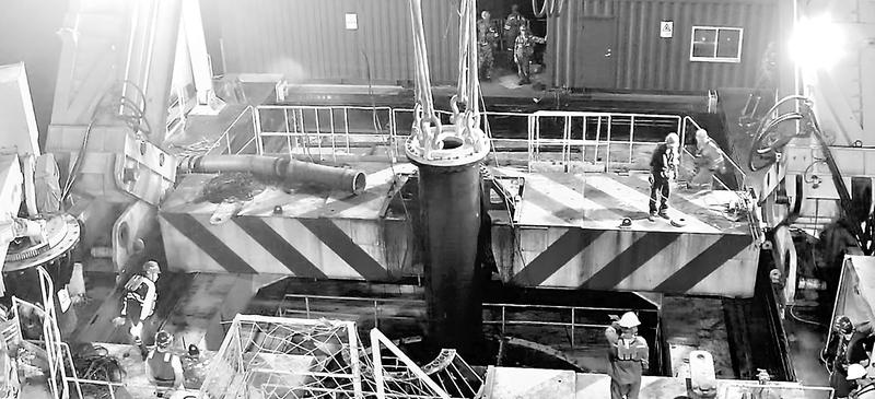 6月14日凌晨1點,錢旺手里的對講機響起了梁博的聲音:“吊機大臂起,吊鉤落,船錨拉緊帶勁,卷揚機放繩。”