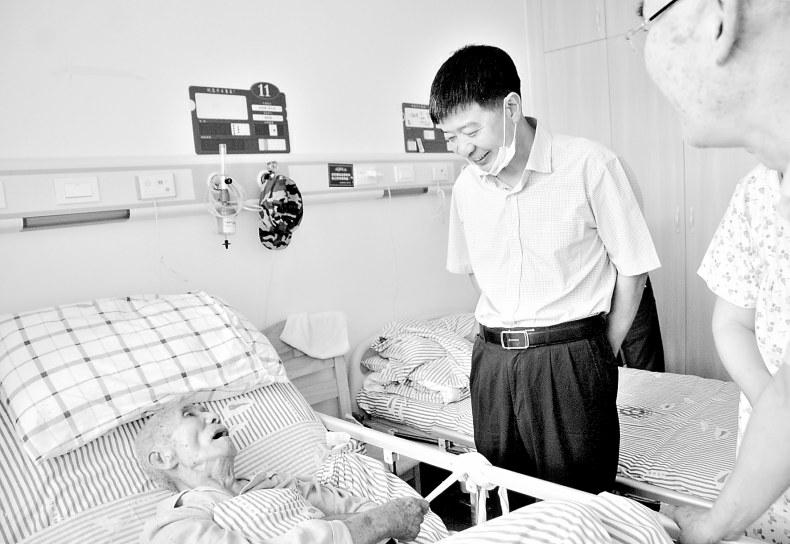 (余鎮(zhèn)洲攝影報道)圖為陳文階在醫(yī)院看望老黨員劉亞峰。