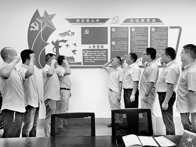 7月1日,福能三愛富(浦城)礦業(yè)開發(fā)有限公司黨支部開展慶“七一”主題黨日系列活動。圖為全體黨員面對鮮紅的黨旗,重溫入黨誓詞,莊嚴宣誓。(李立亮馮棋順攝影報道)