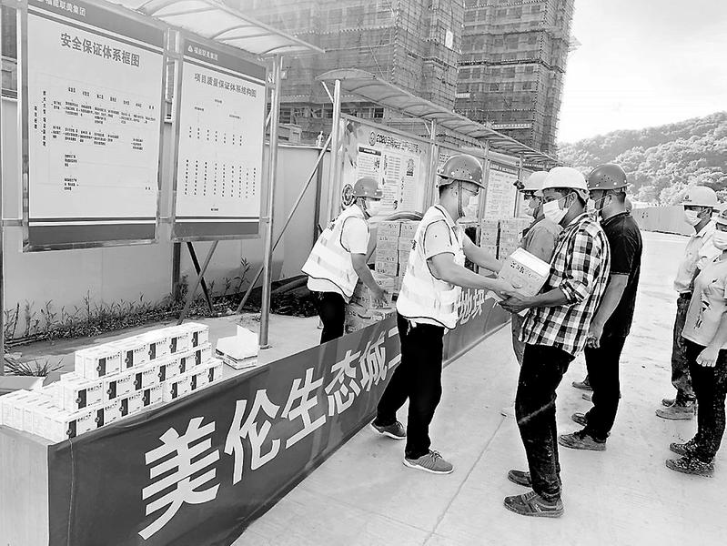 7月6日,聯(lián)美公司龍巖“美倫·生態(tài)城”一期、二期項目聯(lián)合舉辦防暑降溫送清涼活動,為一線工人發(fā)放了菊花茶、藿香正氣水等防暑降溫物品。(陳萬青林聰喜攝影報道)
