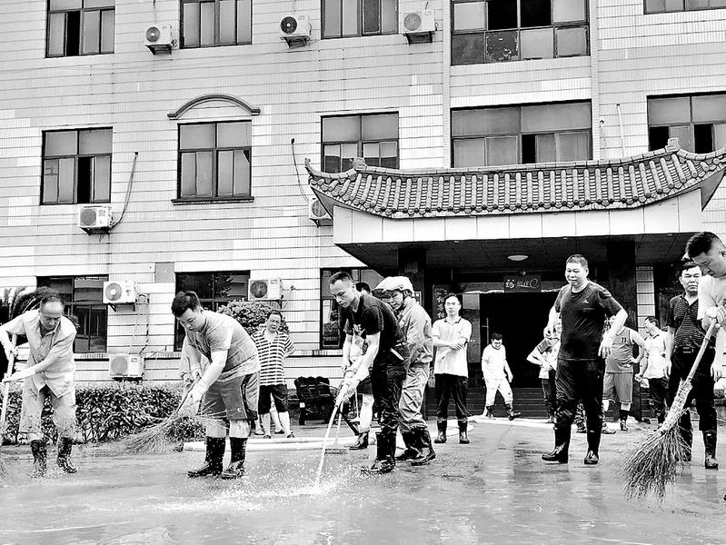 圖為該公司領(lǐng)導(dǎo)與職工一起清除辦公樓前淤泥。