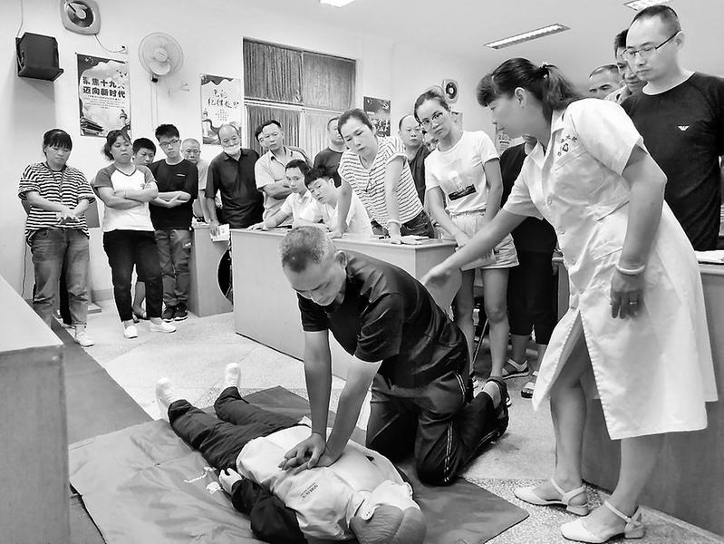 7月15日下午,南紡衛(wèi)材公司工會(huì)、安全環(huán)保部在公司聯(lián)合舉辦應(yīng)急救護(hù)知識(shí)培訓(xùn),公司各車間安全管理員、安全巡視員等50余人參加培訓(xùn)。圖為培訓(xùn)人員在講師的指導(dǎo)下學(xué)習(xí)人工呼吸、胸外按壓等技術(shù)。(陳瓊 攝影報(bào)道)