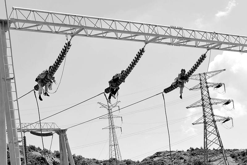 7月21日,為保障電氣設(shè)備安全運(yùn)行,福能新能源公司維檢中心組織檢修人員到頂巖山風(fēng)電場220kV升壓站開展為期4天的設(shè)備定期年檢工作。圖為檢修人員正在清潔220kV線路門型架上方絕緣子。