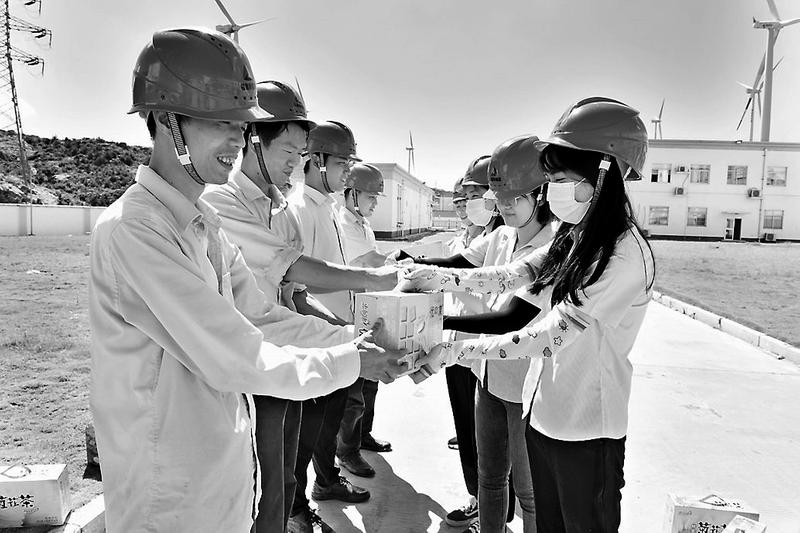 7月22日,福能新能源公司工會(huì)組織女工深入頂巖山風(fēng)電場(chǎng)開(kāi)展“情系員工送清涼,安全健康度盛夏”活動(dòng),為堅(jiān)守在烈日炙烤下的220kV升壓站年檢人員送去消暑飲品。(曾武 攝影報(bào)道)