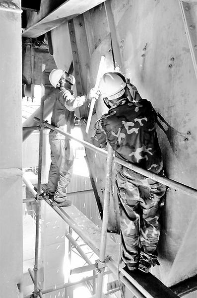 上午10點(diǎn)35分,筆者從輥壓機(jī)檢修現(xiàn)場(chǎng)來(lái)到V選倉(cāng)補(bǔ)焊現(xiàn)場(chǎng)時(shí),看到機(jī)修一班班長(zhǎng)陳水生和電焊工宋潔泉正在腳手架上揮汗如雨,或蹲、或站、或貓腰搬運(yùn)焊接材料。