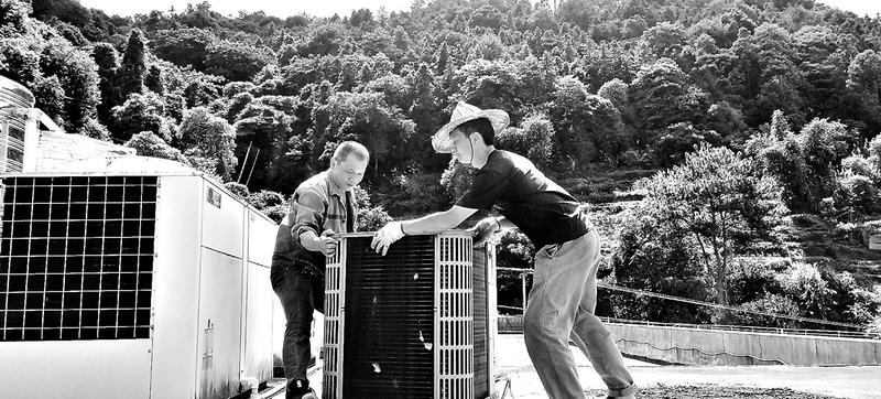 7月25日,天湖山能源公司含春煤礦機(jī)電人員放棄周末休息時(shí)間,冒著高溫安裝澡堂供水空氣熱源泵。