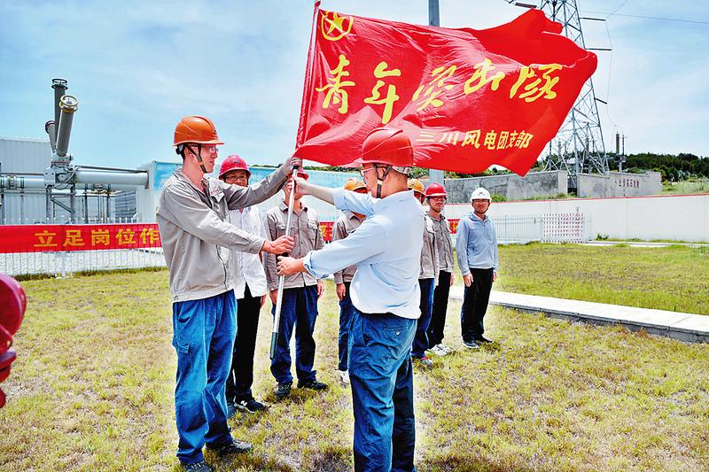 三川風電公司石城及F區(qū)項目兩個220kV升壓站自去年6月19日成功受電以來已持續(xù)運行滿一年。7月27日,該公司升壓站檢修順利完成首檢工作。圖為該公司給升壓站首檢青年突擊隊授旗。(鄭啟團 攝影報道)